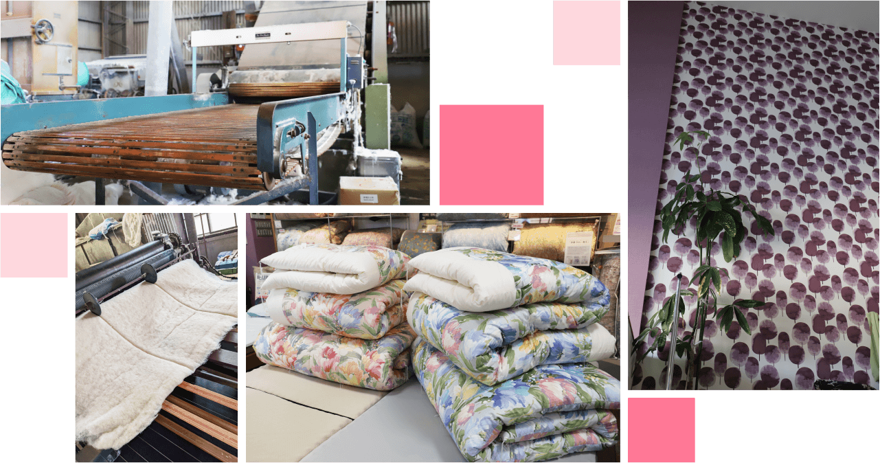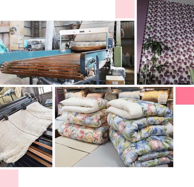 当時より自社工場で木綿わた一筋に、製綿、打ち直し、布団や座布団の仕立て・販売まで自社で一貫して行っています。