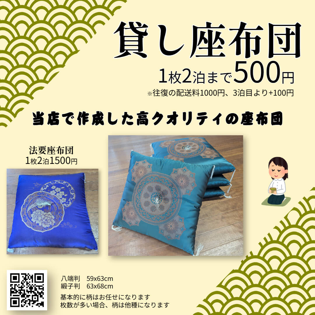 ・1枚2泊500円、追加3泊目より+100円となります。法要座布団は1枚2泊で1500円となります。